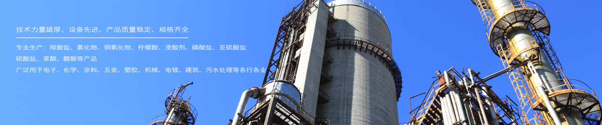 主要產品有:羧酸鹽、氯化物、銅氧化物、檸檬酸、浸酸劑、磷酸鹽、亞硫酸鹽、硫酸鹽、草酸、醋酸等,廣泛用于電子、化學、涂料、五金、塑膠、機械、電鍍、建筑、污水處理等各行各業(yè)。